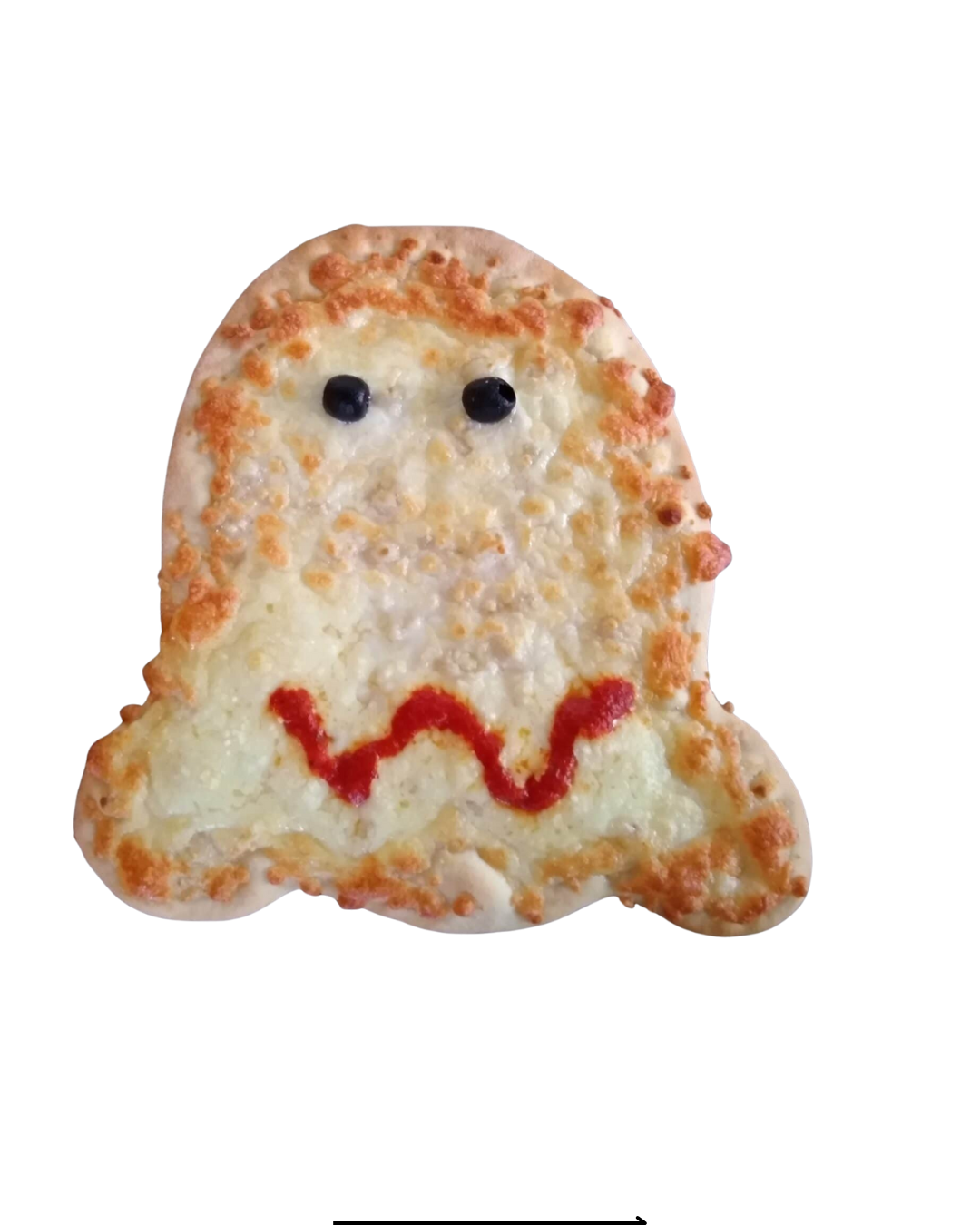 - Spread a thin layer of cream sauce over the ghost-shaped dough.