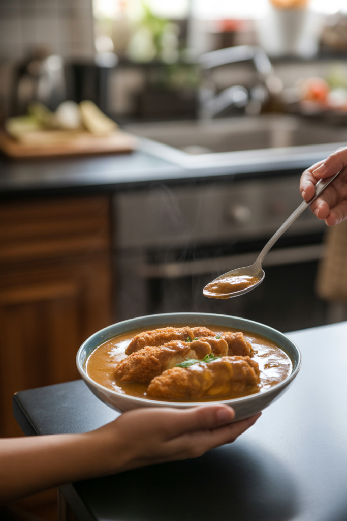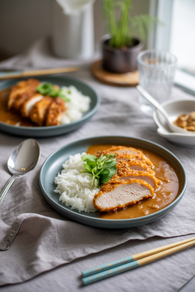 Maybe it’s the sound of the breaded chicken crisping in the pan, or the way the curry sauce smells warm and gently spiced as it simmers. Or maybe it’s that first bite — when the crunchy coating gives way to juicy chicken, soaked in silky curry sauce that’s rich without being heavy.