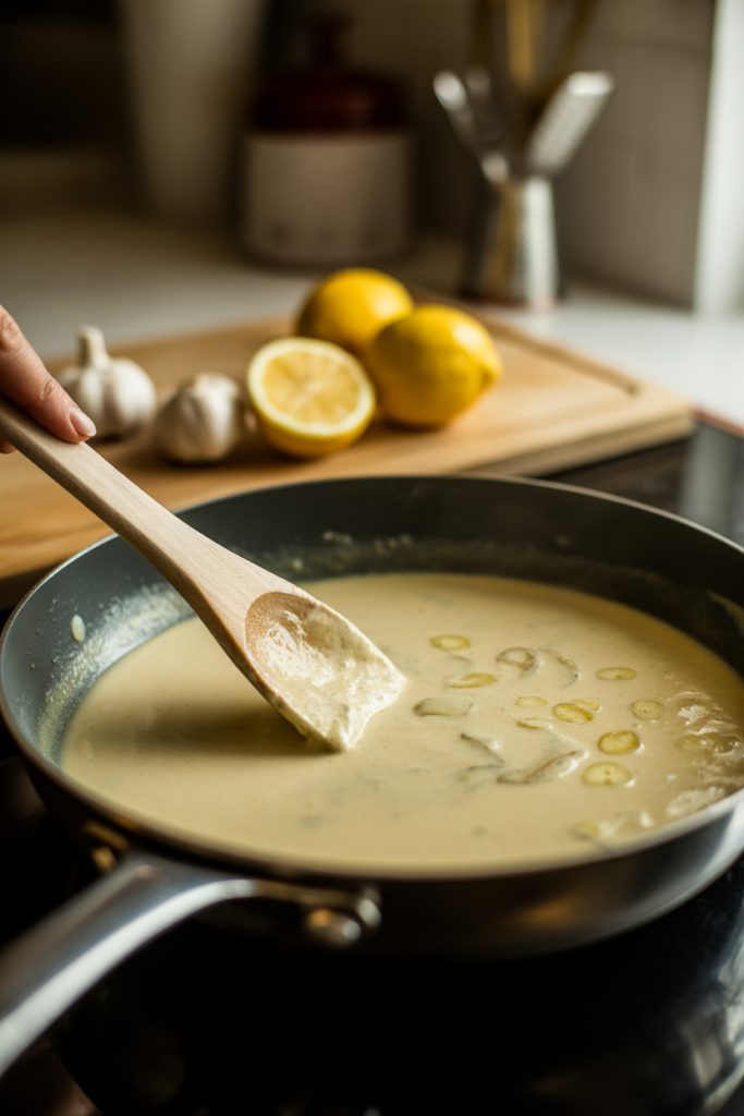 Pour in the broth and scrape up the browned bits from the pan. This is where the sauce starts to taste deep and savory. Stir in the cream slowly, watching it turn silky and pale as it simmers. Add lemon juice and zest, then parmesan, letting the sauce thicken gently.