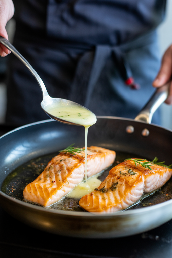 Spoon the garlic butter sauce over the salmon repeatedly for about 30 seconds.