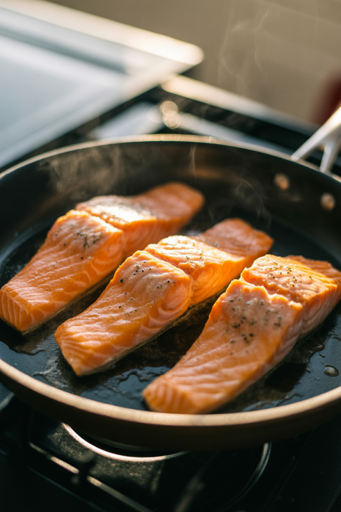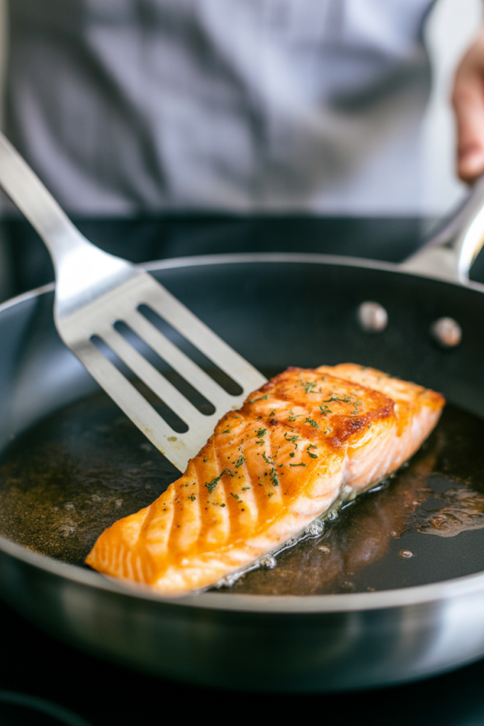 The salmon develops a crispy golden crust on the outside while staying tender and flaky inside.