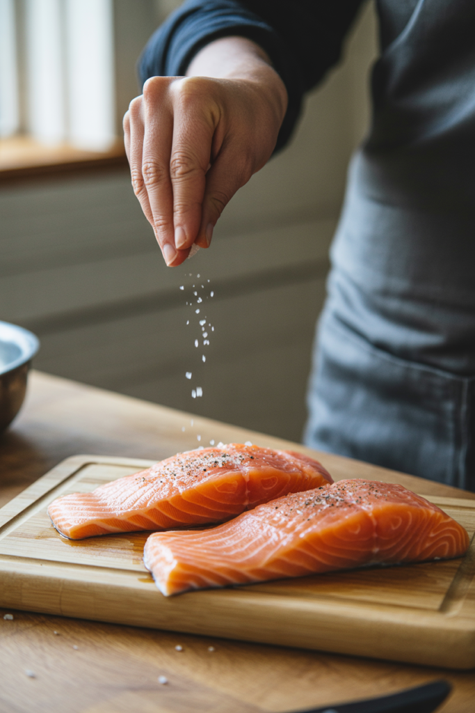 Pat the fillets dry with paper towels. This step is crucial because removing moisture helps the salmon develop a crispy crust.